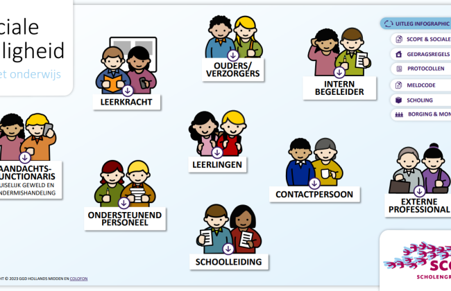 Door te klikken op de pictogrammen in de infographic kom je op achterliggende slides met meer informatie over de afspraken m.b.t. Sociale veiligheid binnen SCOPE en onze school.